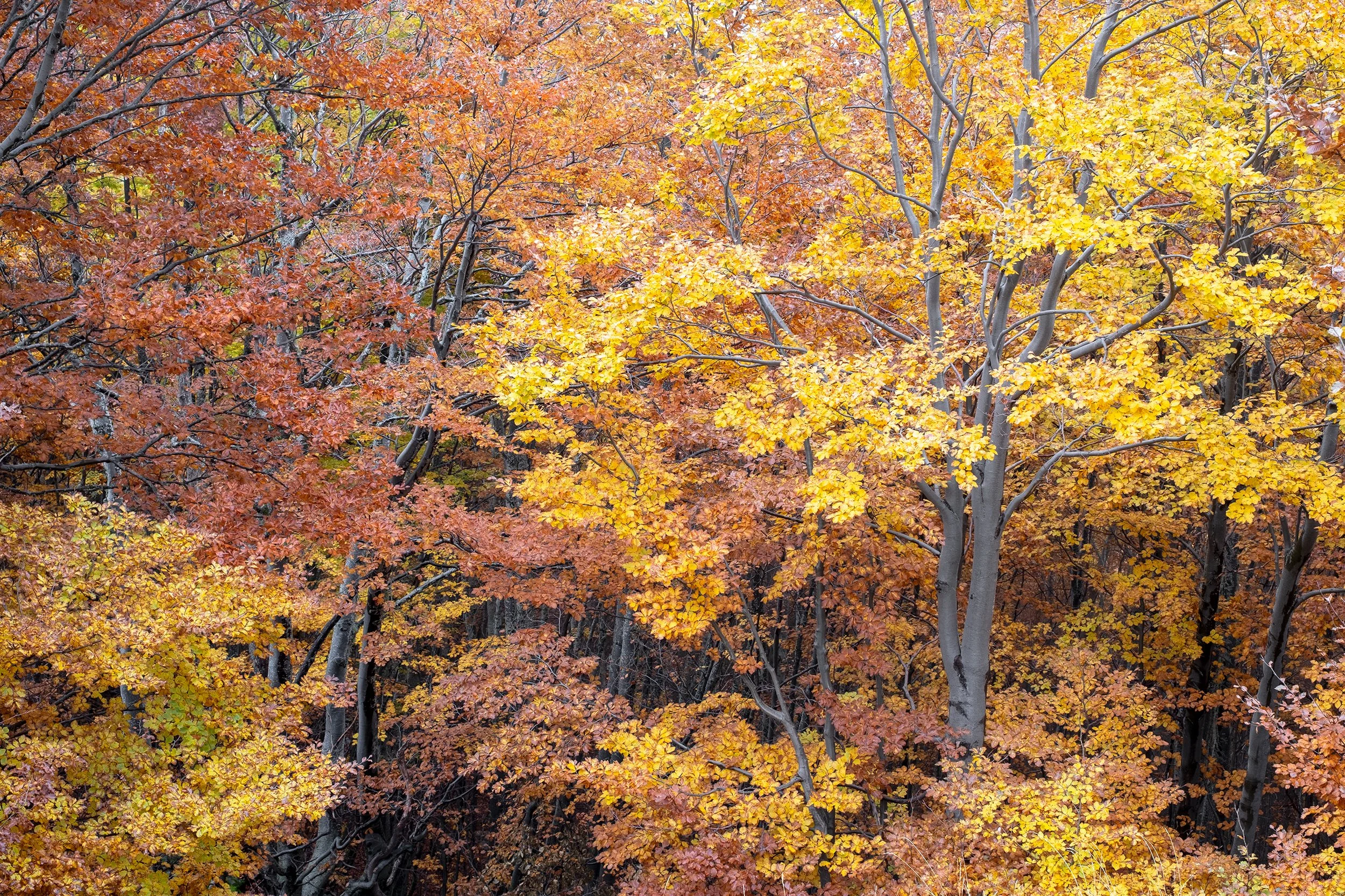 Val di Rose, in the heart of the Abruzzo National Park. From left to right: Woods beyond trail I4, October 2025 - Maple and Beech leaves, October 2025 - Beech forest along trail I4, October 2025.